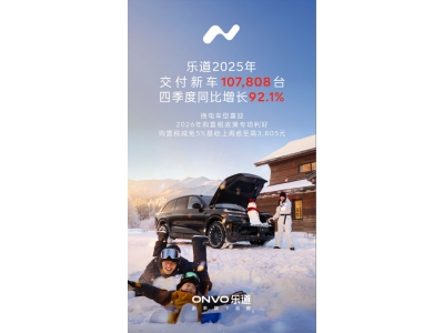 1月1日消息,乐道汽车今日公布了最新销量成绩,2025年第四季度交付38,290台,同比大涨92.1%;全年累计交付破10万,达到107,808台,乐道品牌成交均价超25万元,位列新势力品牌第一梯队。