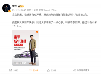雷军因感冒严重推迟跨年直播:1月3日晚7点见