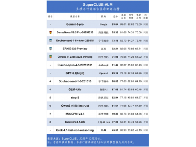12月31日消息,近日,SuperCLUE-VLM多模态视觉语言基准测评12月总榜公布。 谷歌的Gemini-3-pro以83.64分遥遥领先,字节跳动的豆包大模型以73.15分跻身前三,展现出国内大模型的竞争力。 此次