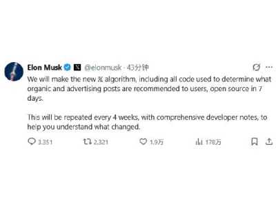埃隆•马斯克近日宣布,X平台将在未来七天内向公众开源其新版算法,该算法决定向用户推荐哪些帖文及广告。据马斯克介绍,X平台将附上详尽的开发者说明文档,帮助公众理解算法