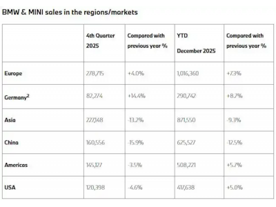 宝马集团近日公布了集团销量数据,显示其在2025年全年销量达到2,463,715辆,同比微增0.5%。尽管全球整体表现平稳,但各区域市场表现差异显著,其中欧洲市场全年累计销量达1,016,360辆