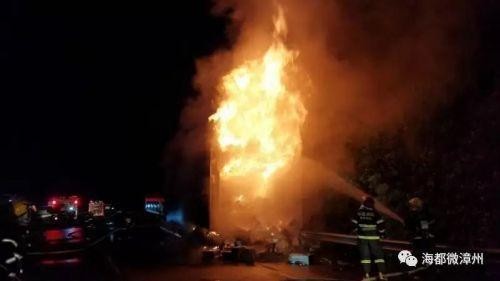 漳州高速交通执法二大队接报后,立即联系“119”消防部门,火速赶往现场救援。当交通执法员到达现场时,该车后尾部已经被大火包围,所幸车上两名驾驶员都没受伤,且已经将车头与挂车分离,车厢内货物的爆破声不时传来。