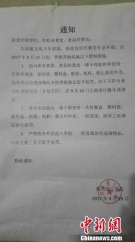9月23日电日前,江西南昌理工学院对全校学生、校内所有食堂和食品经营店下发了一则通知,自9月22日起,要求校内所有食堂及食品经营店,一律不得提供和使用一次性餐具、塑料袋等,并严禁外卖进校。
