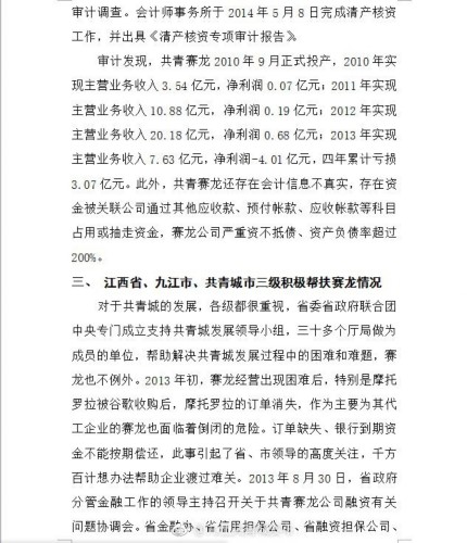 在微博中共青城市详细列举了赛龙公司的有关情况和第三方对其的审计结果,以及江西省、九江市、共青城市三级积极帮扶赛龙情况。