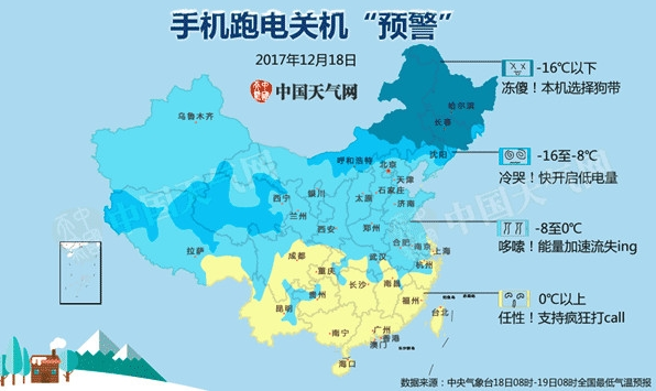原标题:手机跑电关机地图来了! 寒潮来袭你的手机扛得住吗?