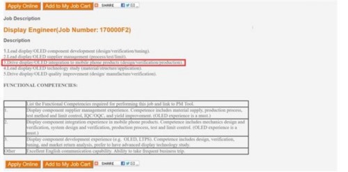 职位需求中明确要求“手机显示部件的集成,包括设计、生产、测试和IQC等等”,而且都标注了“必须有开发OLED的经验”。