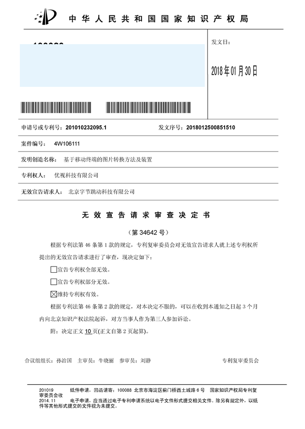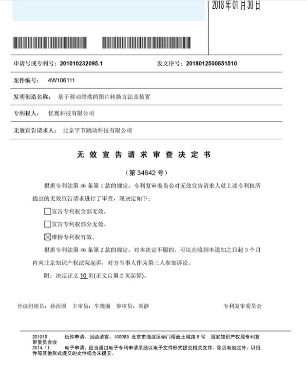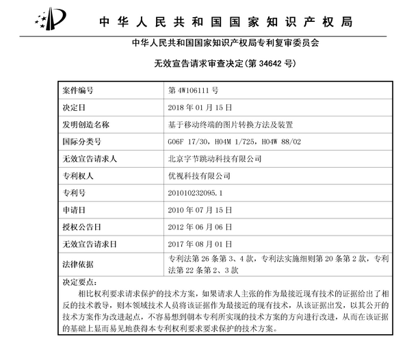 2月2日上午消息,1月30日,国家知识产权局驳回了北京字节跳动科技有限公司(即今日头条)请求宣告优视科技有限公司(UC)的“基于移动终端的图片转换方法及装置”专利的无效宣告请求。专利复审委员会称维持发明专利权有效。