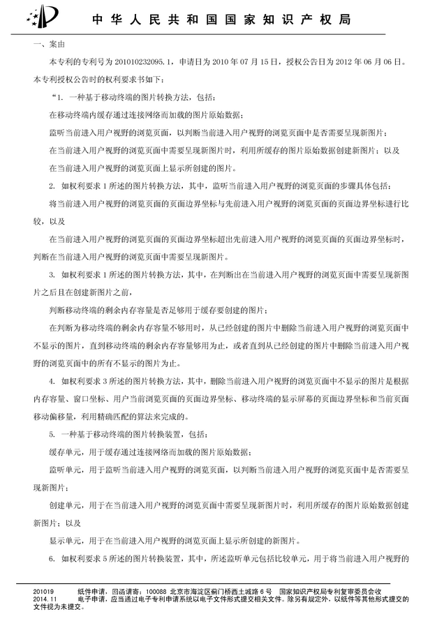 此前UC曾向法院请求判今日头条立即停止侵害专利号为 ZL201010232095、名称为“基于移动终端的图片转换方法及装置”发明专利 (“涉案专利”)的行为,即立即停止开发和运营“今日头条”应用程序 (“被控侵权产品”),停止通过任何渠道提供被控侵权产品的下载服务;立即销毁所有关于被控侵权产品的宣传资料;请求判令被告连续 1 个月在其官方网站(www.toutiao.com)上刊登声明以消除给原告带来的不良影响;请求判令被告向原告支付侵权赔偿金 1200 万元以及原告为制止侵权行为而支付的合理费用支出共计人民币 50 万元,原告保留根据进一步获知的证据对赔偿金额予以增加的权利;请求判令被告承担本案的全部诉讼费用。