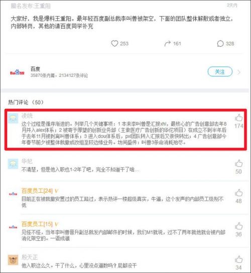 这一条评论被点赞置顶到了评论区第一位置,显然,路过的网友看到此段发声,难免会认为李叫兽在百度已时日不多。