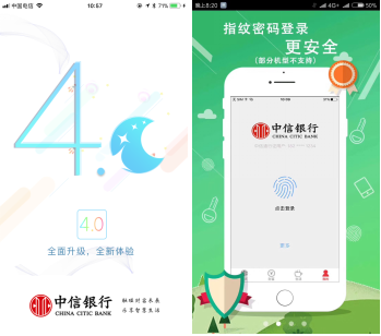 日前,中信银行正式发布了手机银行V4.0版,使用了全新的操控界面及指纹密码登陆,实现了极快的登陆速度,用户无需再记密码,便可进行快速、安全的交易。
