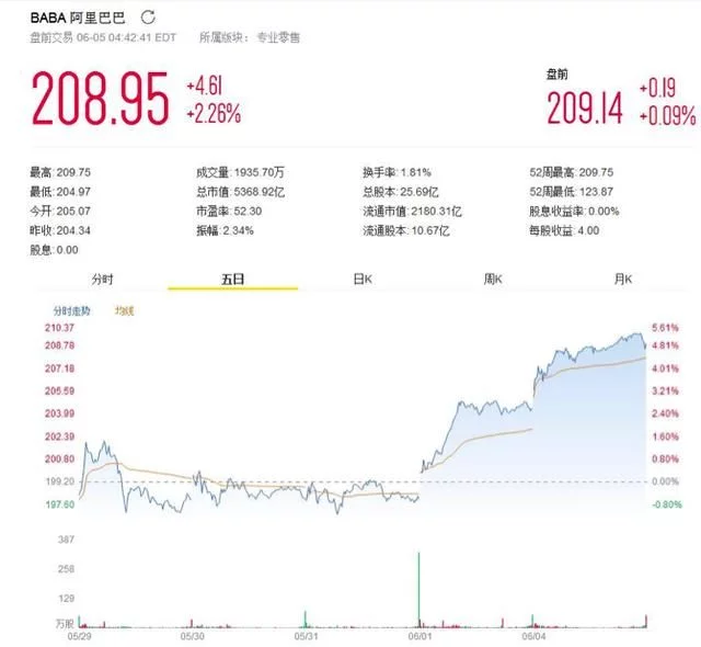 从6月1日天猫618正式启动以来,阿里巴巴股价瞬间爆发!在整个华尔街的震撼中,蹭蹭蹭上演“三步上篮”,从199.82美元飙涨到208.95美元,市值从5127亿美元上涨到5361亿美元。这轮上涨,在3个交易日内涨幅高达234亿美元,直接涨出半个京东,彻底甩开腾讯!这样的暴涨让大量全球顶尖投资机构猝不及防,后悔没有提前买入阿里的股票。