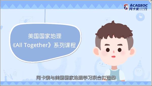 阿卡索少儿课程体系立足于入学启蒙到高中阶段的孩子,并精确划分10个级别,设置少儿主修课程与少儿辅修课程,涵盖英语技能训练与素养提升。如阿卡索与美国国家地理学习联合打造的《All Together》系列课程,通过借助美国国家地理学习优质的音频和图片资源,直观形象的把世界呈现给学生,用于强化5-12岁儿童及青少年的语言能力和思维模式,培养其英语综合能力运用。