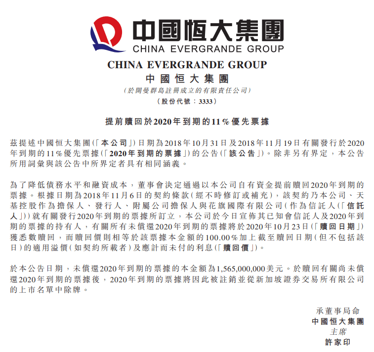 恒大将提前偿还 106 亿元债券