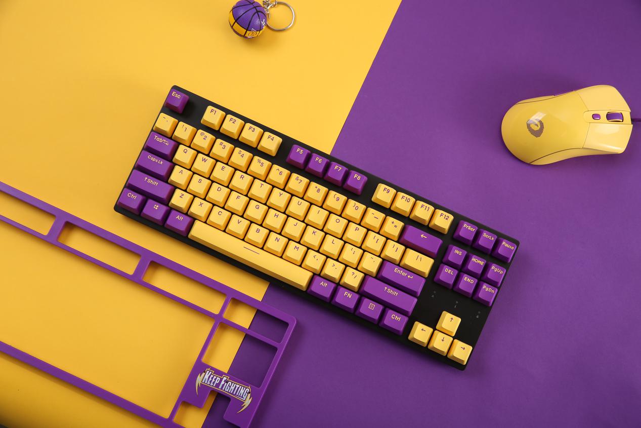 达尔优A87紫金版机械键盘采用更为大胆的紫金配色方案,亮黄色与紫色基调搭配,让键盘外观极具动感,给我们一种强烈的视觉冲击。