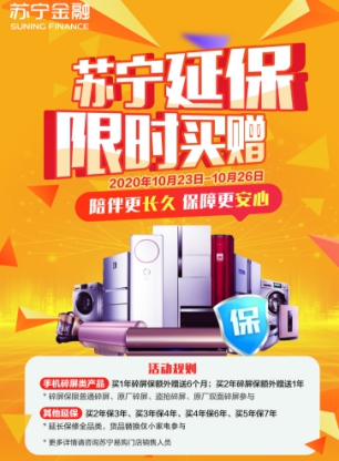 10月23日至26日,凡是在苏宁门店购买延长保修产品,品类覆盖通讯(含iPhone)、电脑(含iPad、Mac)、数码、黑电、冰洗、空调、厨卫及小家电等,就能够获得买2年保3年,买3年保4年,买4年保6年,买5年保7年的大力优惠。