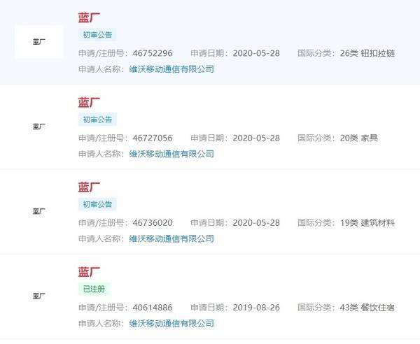企查查信息显示,维沃移动通信有限公司已于2019年8月26日注册多个“蓝厂”商标,国际分类为“42类设计研究”“43类餐饮住宿”等,状态为“已注册”。另外,vivo今年还申请注册了更多“蓝厂”商标,并已通过初审。