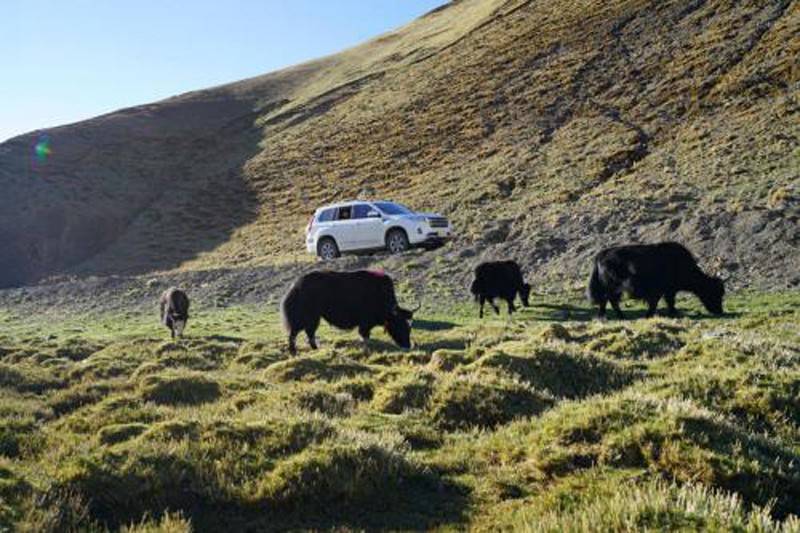 牧场里的“主人”是成片悠然自得的牦牛,似乎对哈弗H9已经司空见惯,也不回避,而是用湿漉漉的眼睛凝望着来客。我们实在不忍打扰它们,脚步轻轻地走进梦幻般的原野。天堂不过如此吧!