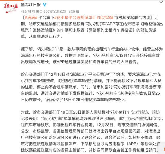 12 月 28 日,哈尔滨市交通部门协调网信、公安、市场监管、省通信管理局等部门就滴滴出行平台违规经营问题,对滴滴出行科技有限公司哈尔滨分公司进行了联合约谈。联合约谈后,如其拒不整改,哈尔滨市将把违法违规情况及暂停发布、下架移动互联网应用程序(APP)等载体处置建议逐级报送至对应的省级主管部门,并抄送同级联合监管工作机制组成部门。