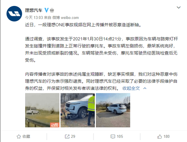 理想汽车官方微博称,最近有一段理想 ONE 事故视频在网上传播并被恶意造谣断轴。理想汽车表示,事故原因为车辆与路旁灯杆发生碰撞并撞到路上正常行驶的摩托车。事故车辆左侧损伤,悬架系统完好,并未出现受损或断裂的情况。针对内容传播者对该事故缺乏事实依据的主观臆断,理想汽车表示强烈谴责。同时,理想汽车已经采取了必要的法律手段维护自身的权益,并保留对相关发布者诉诸法律的权利。