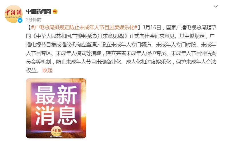 3 月 16 日,国家广播电视总局发布关于公开征求《中华人民共和国广播电视法(征求意见稿)》意见的通知。征求意见稿指出,广播电视节目集成播放机构应当通过设立未成年人专门频率频道、未成年人专门时段、未成年人节目专区、未成年人模式等措施,建立完善未成年人保护专员、未成年人节目评估委员会等机制,防止未成年人节目出现商业化、成人化和过度娱乐化,保护未成年人合法权益。广播电视节目包含可能影响未成年人身心健康内容的,广播电视节目集成播放机构应当以显著方式进行提示并合理安排播放时间、版面。