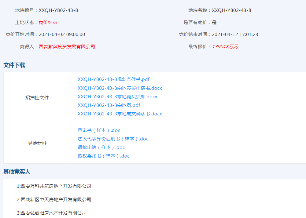 其它竞买人:1: 西安万科共筑房地产开发有限公司 2: 西咸新区中天房地产开发有限公司 3: 西安弘致阳房地产开发有限公司