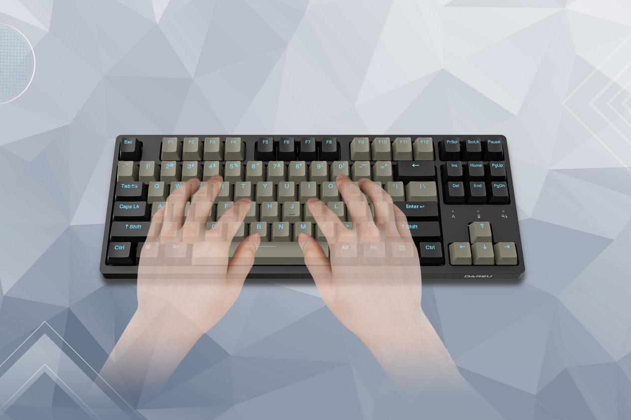 DAREU-A87全插拔定制轴三模版机械键盘搭载着手感稳定的PBT键帽与达尔优定制轴,内置3.5mm厚度高韧性消音硅胶垫搭配1.5mm厚度的铁质面板形成紧贴的闭合回路,有效降低键盘在使用过程中因敲击轴体开关时产生震动带来的细碎杂音,给你更纯粹舒适的键轴手感。