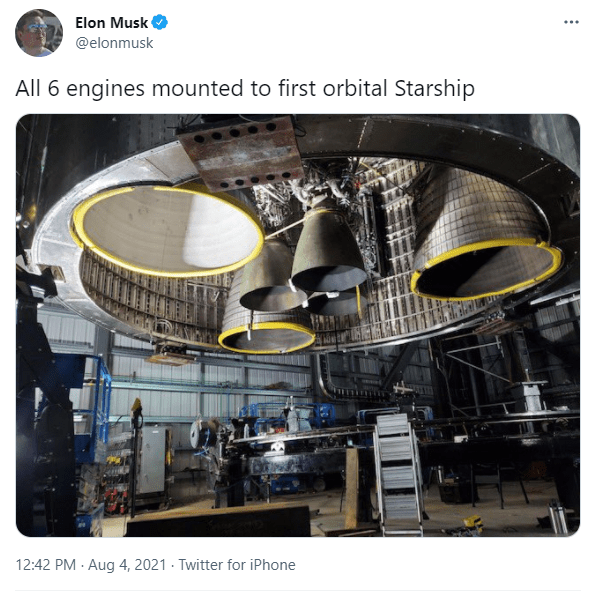8 月 4 日讯,太空探索技术公司(SpaceX)创始人马斯克今日在社交平台上晒出照片并配文:「6 个发动机都安装在一艘轨道星舰飞船上」。