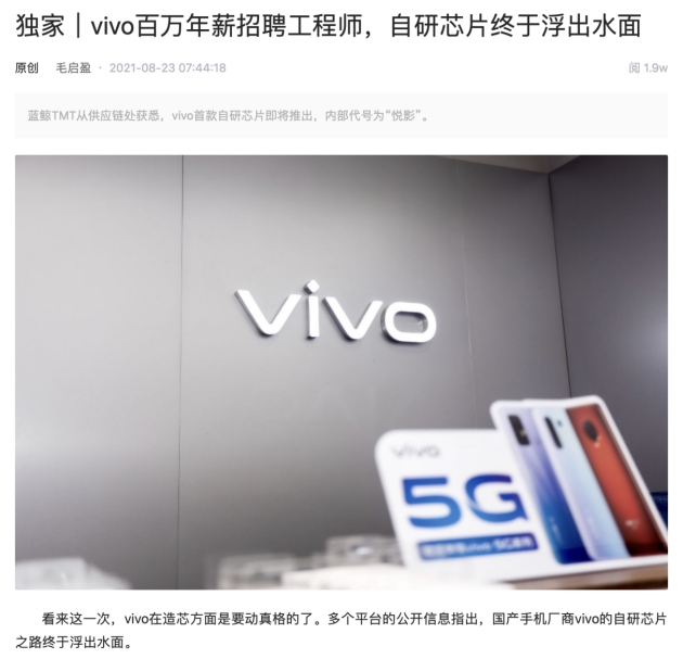 最近几天,“vivo造芯”的各种信息被媒体接连曝光,坊间对于vivo自研芯片的能力与进度也有了一些不同的猜想。从目前爆料的各种信息来看,vivo对芯片制造或许早有布局。早在2019年以前,vivo自研芯片就已经在规划范围内,高薪招聘芯片研发人才、芯片商标注册、建立专门的芯片研发中心……大手笔招兵买马、筹备布局,到逐渐建立起自己的芯片研发团队,再到最终实现量产,vivo一步步展现其在芯片研发领域所具备的实力与决心。