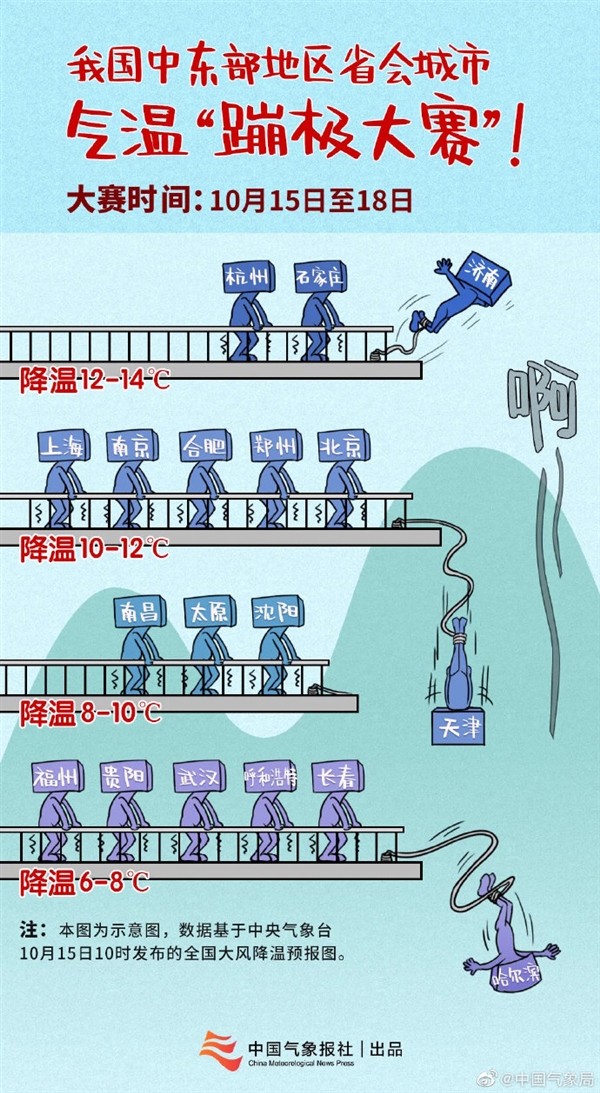 原标题:全国气温蹦极大赛开启 局地降温 14℃以上