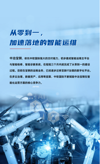 王建军表示中冶宝钢通过与中软国际深入合作,在短短三个月内就将数字化基座、智能运维运营平台以及生态运营&服务能力有机整合,初步建成智能运维主平台与智能检修、智能诊断系统。目前在宝钢的运维业务,已经逐步迁移至这套数字化平台。