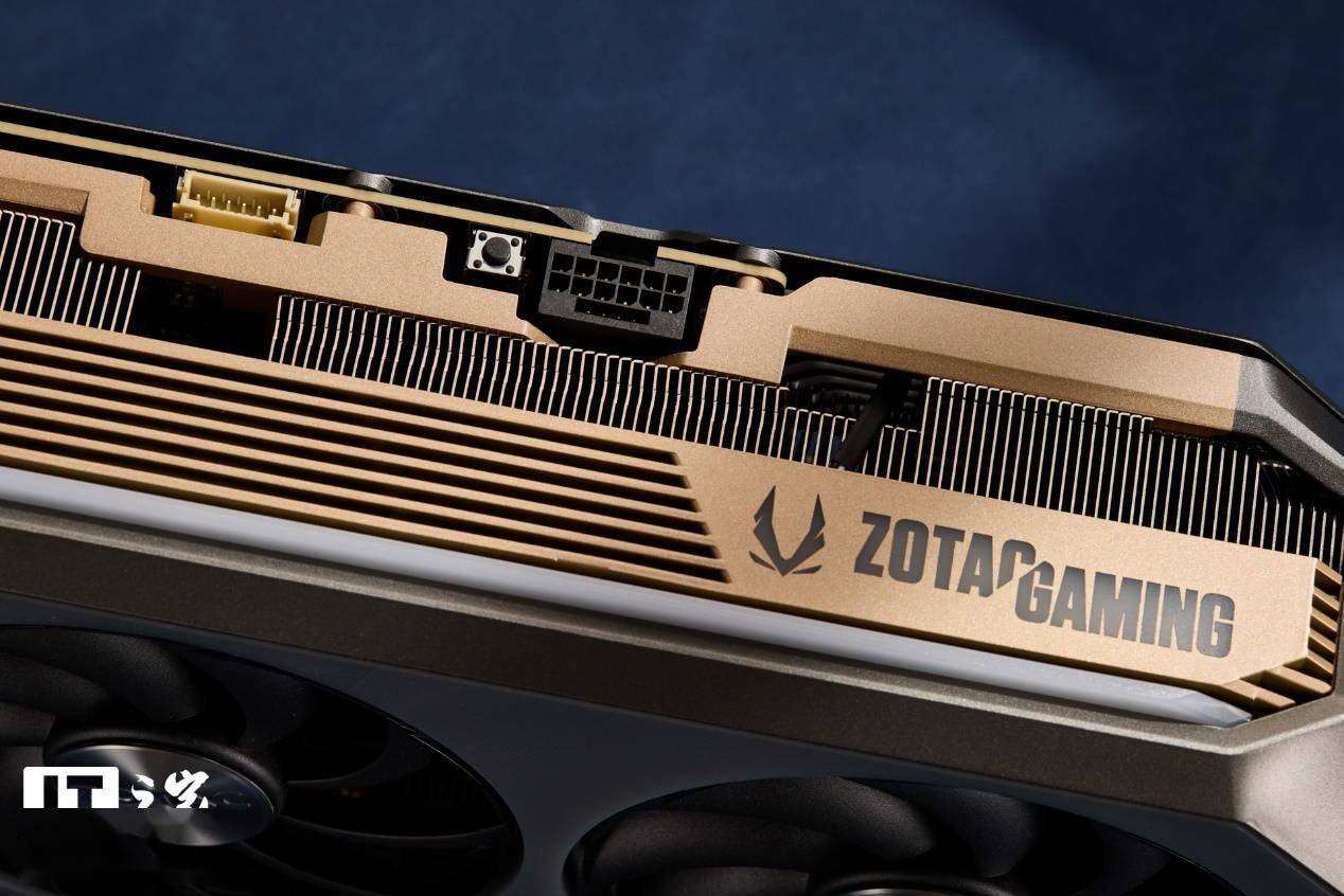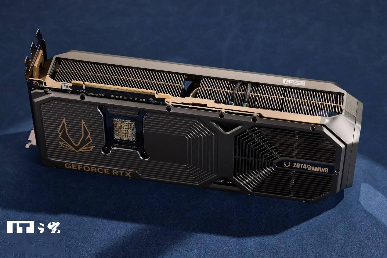 显卡背板通过大量规整切割线构成的多边形图案,进一步统一了视觉基调。右侧密集的栅条进风口巧妙融入了ZOTAC GAMING系列标志,边缘部分与外壳设计相呼应,同样采用了斜切倒角处理。显卡不仅背板采用了铝合金加固处理,中框上下也设计了一圈金色的金属加固合金中框,提升了整体结构的稳固性。