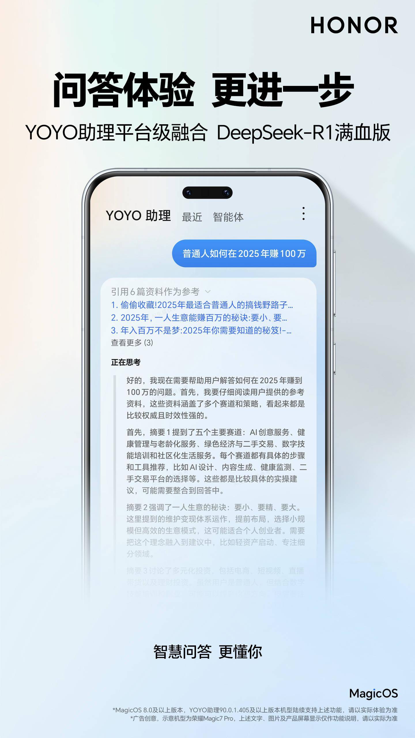 荣耀YOYO助理升级:DeepSeek-R1满血版,开启深度思考新模式