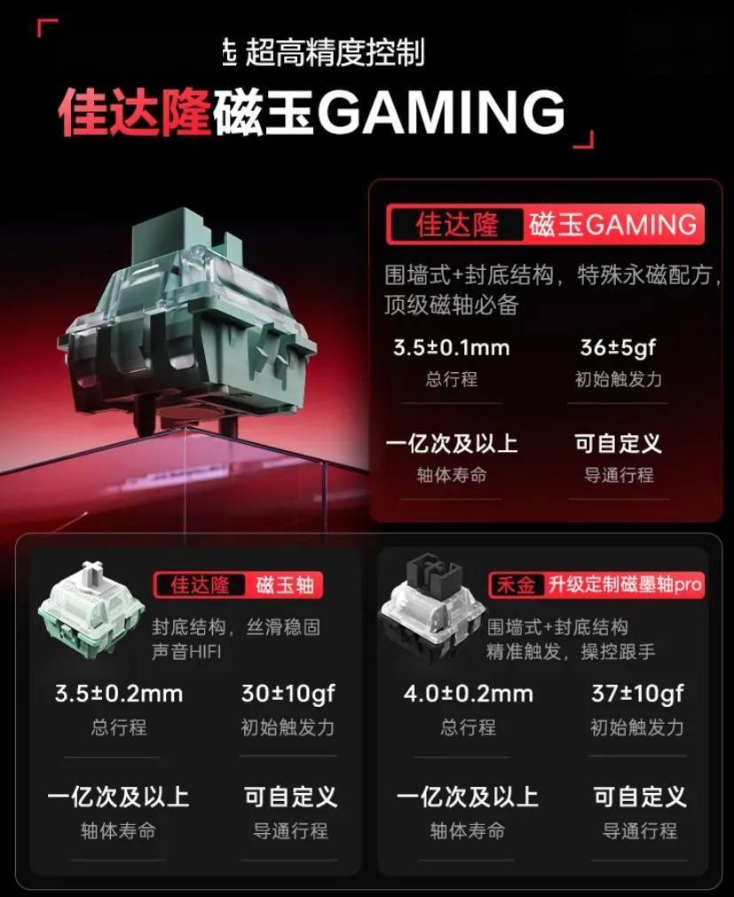 这款键盘提供了三种不同的轴体供消费者选择,每一种轴体都有其独特的特点和参数。首先是佳达隆磁玉 GAMING 轴,其结构采用了围墙式加封底设计,并使用了特殊的永磁配方。该轴体的总行程为3.5±0.1mm,初始触发力为36±5gf,导通行程可自定义,且轴体寿命高达一亿次以上。