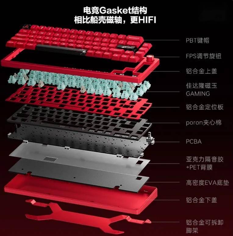 键盘采用了电竞级的Gasket结构,外壳材料为6063铝合金,配备了高质量的PBT+PC键帽。其68%键位分区布局不仅紧凑而且高效,同时键盘还配备了金属可拆卸式脚架,进一步提升了使用的舒适度和灵活性。