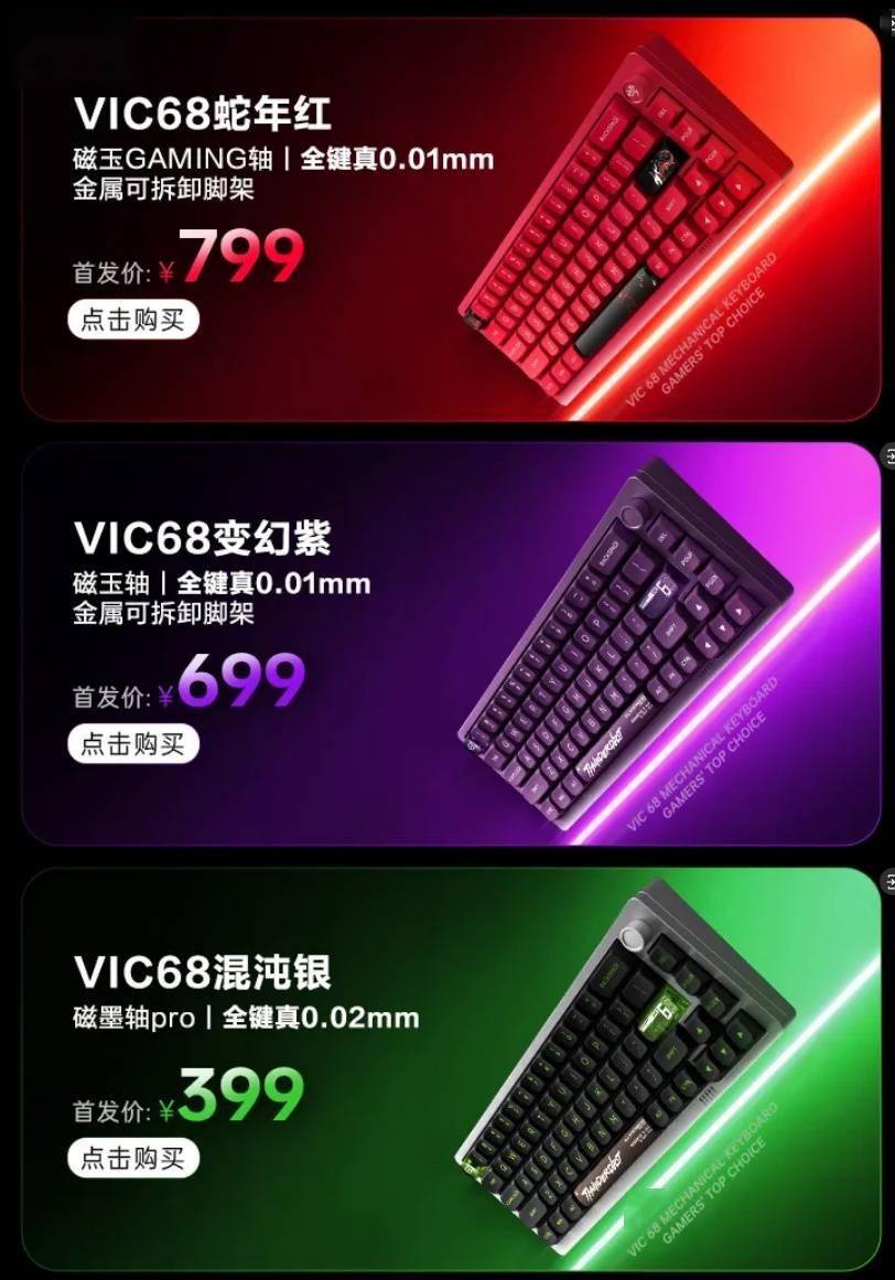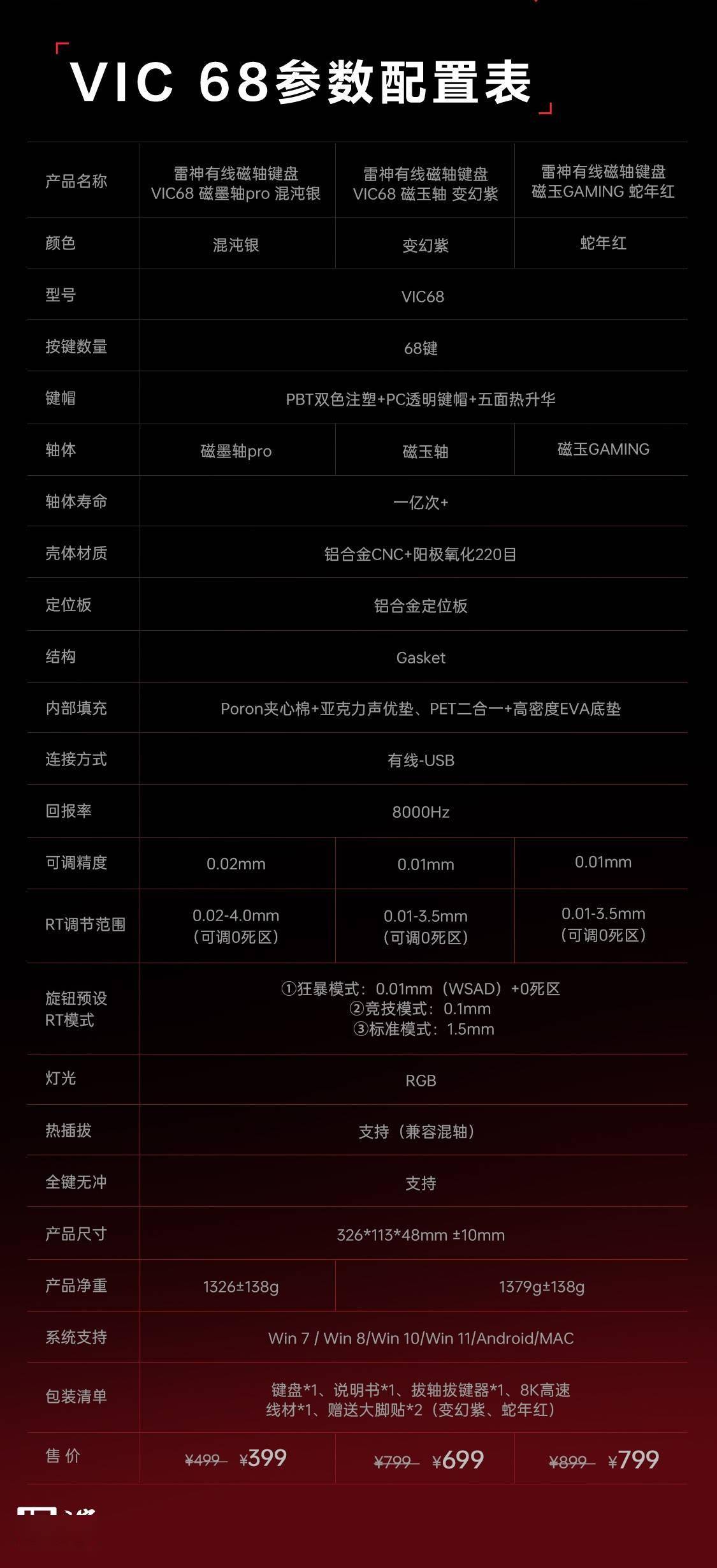 在配色方面,雷神有线磁轴键盘VIC68提供了三款不同的选择。磁墨轴 Pro 版本搭配混沌银配色,售价为399元;磁玉轴版本则与变幻紫配色以及金属可拆卸脚架一同推出,售价为699元;而磁玉 GAMING 轴版本则采用了蛇年红配色,并配备了金属可拆卸脚架,售价为799元。