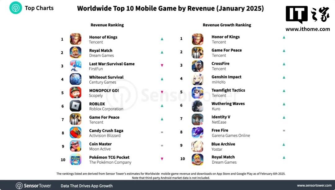 近期,全球移动游戏市场迎来了新一轮的激烈竞争,根据知名数据分析机构Sensor Tower的最新报告,2025年1月的游戏排行榜上,《王者荣耀》以其卓越表现,成功跻身全球收入最高移动游戏的第六名,这一成就无疑为腾讯游戏再添辉煌。