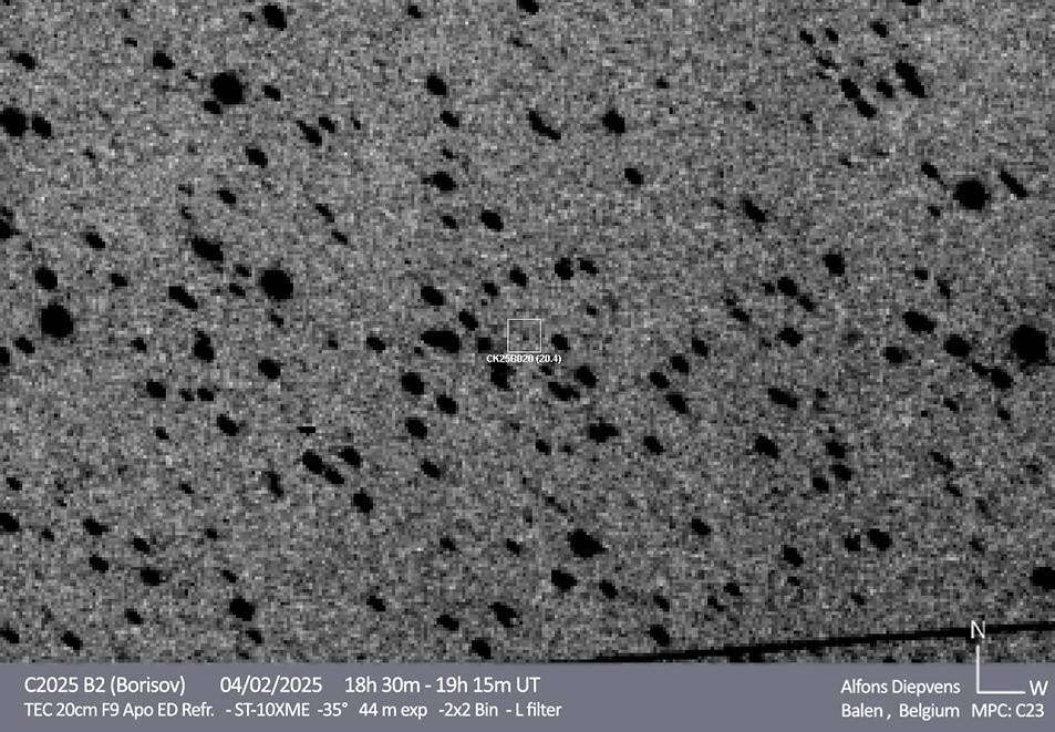 这颗新发现的彗星被命名为C/2025 B2,最初于今年1月20日被鲍里索夫观测到。根据天文学家的预测,C/2025 B2彗星有望在2026年9月通过近日点,那时它将与太阳保持约8.26个天文单位的距离,这一距离大致相当于太阳到土星之间的间距。