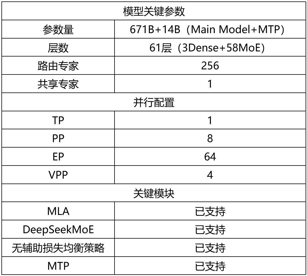 具体而言,MindSpeed平台在支持DeepSeek V3模型时,采用了高效的并行配置和精细的模型参数设置。这些设置确保了模型在预训练和微调阶段能够达到最佳性能。相关配置和参数的详细信息,以图表形式呈现,清晰直观。