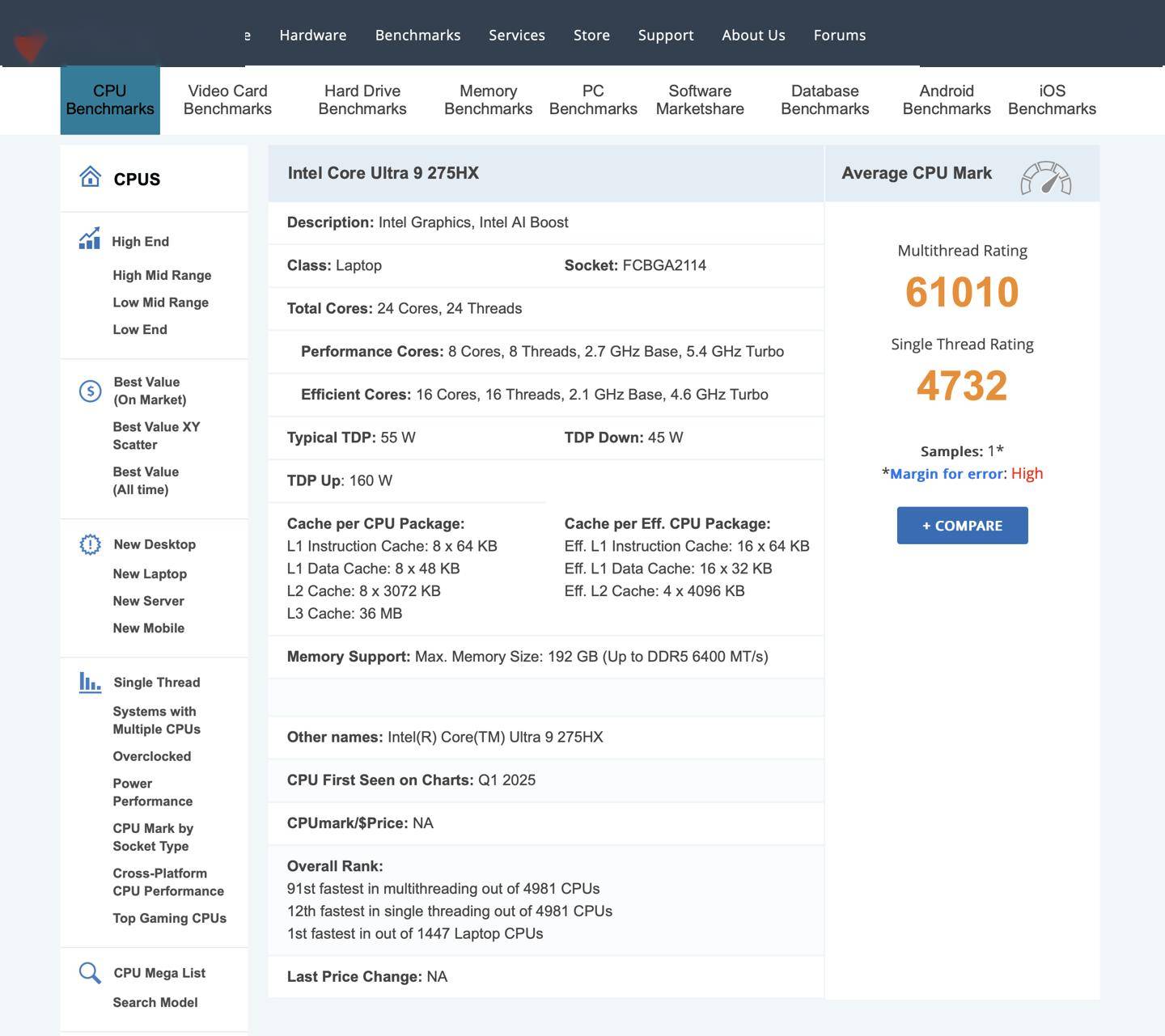 据PassMark官网数据显示,酷睿Ultra 9 275HX的跑分高达61010,相较于AMD锐龙9 7945HX3D,其性能提升了约6.82%。同时,与英特尔自家的上一代产品酷睿i9-14900HX相比,性能更是提升了惊人的33.74%。然而,值得注意的是,目前酷睿Ultra 9 275HX的测试样本量仅为1个,这意味着当前的跑分数据可能存在一定误差。未来随着更多样本的加入,其跑分成绩可能会有所变动。