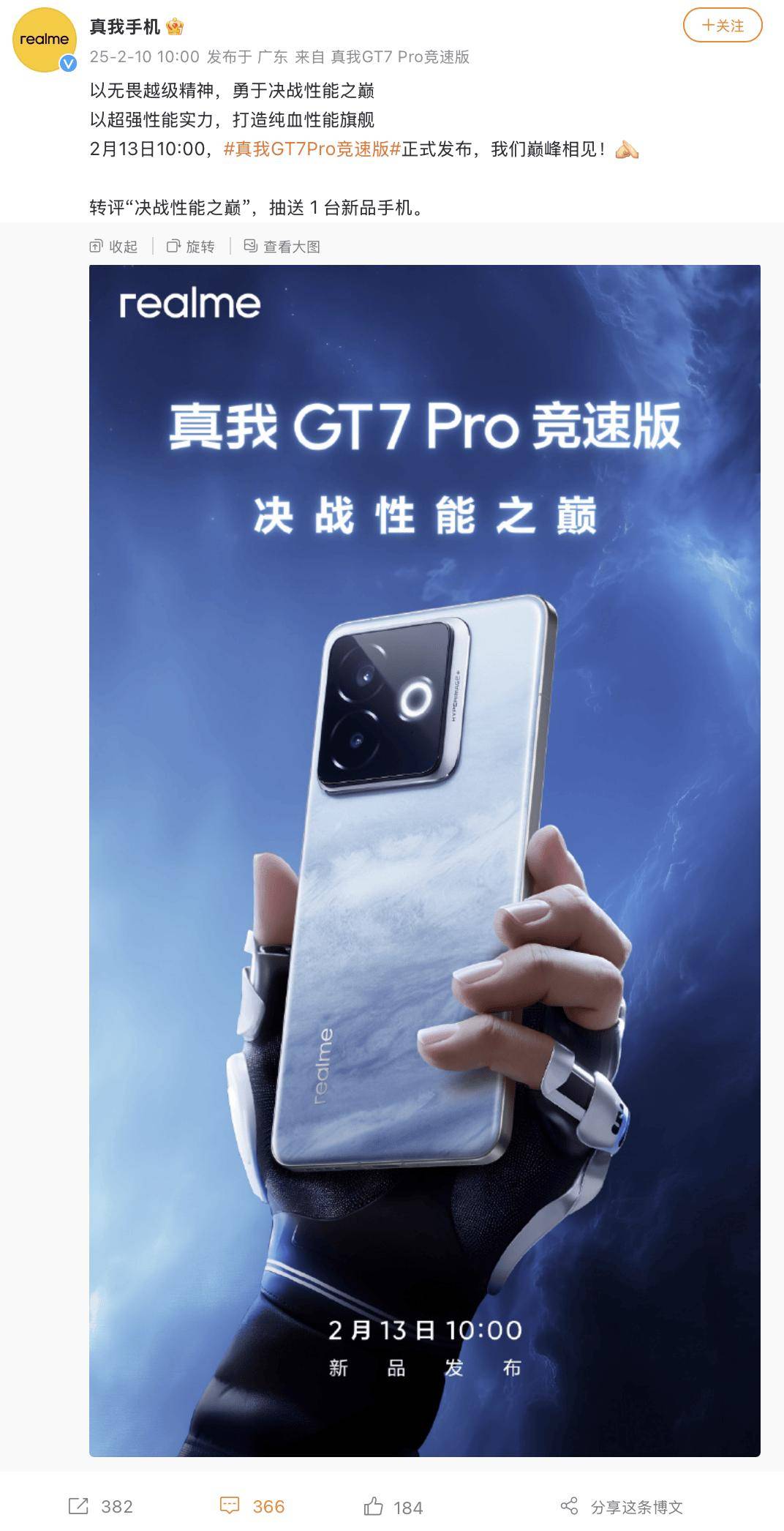 realme真我官方近日在微博上揭晓了备受期待的新品——真我GT7 Pro竞速版手机的发布日期,定于2月13日上午10时正式亮相。更令人兴奋的是,官方在发布前夕还透露了该机型将推出一款名为“海王星探索版”的全新配色,设计灵感汲取自海王星那神秘的蓝色调,并融入了独特的星纹工艺,为手机增添了一抹科幻与浪漫交织的风采。