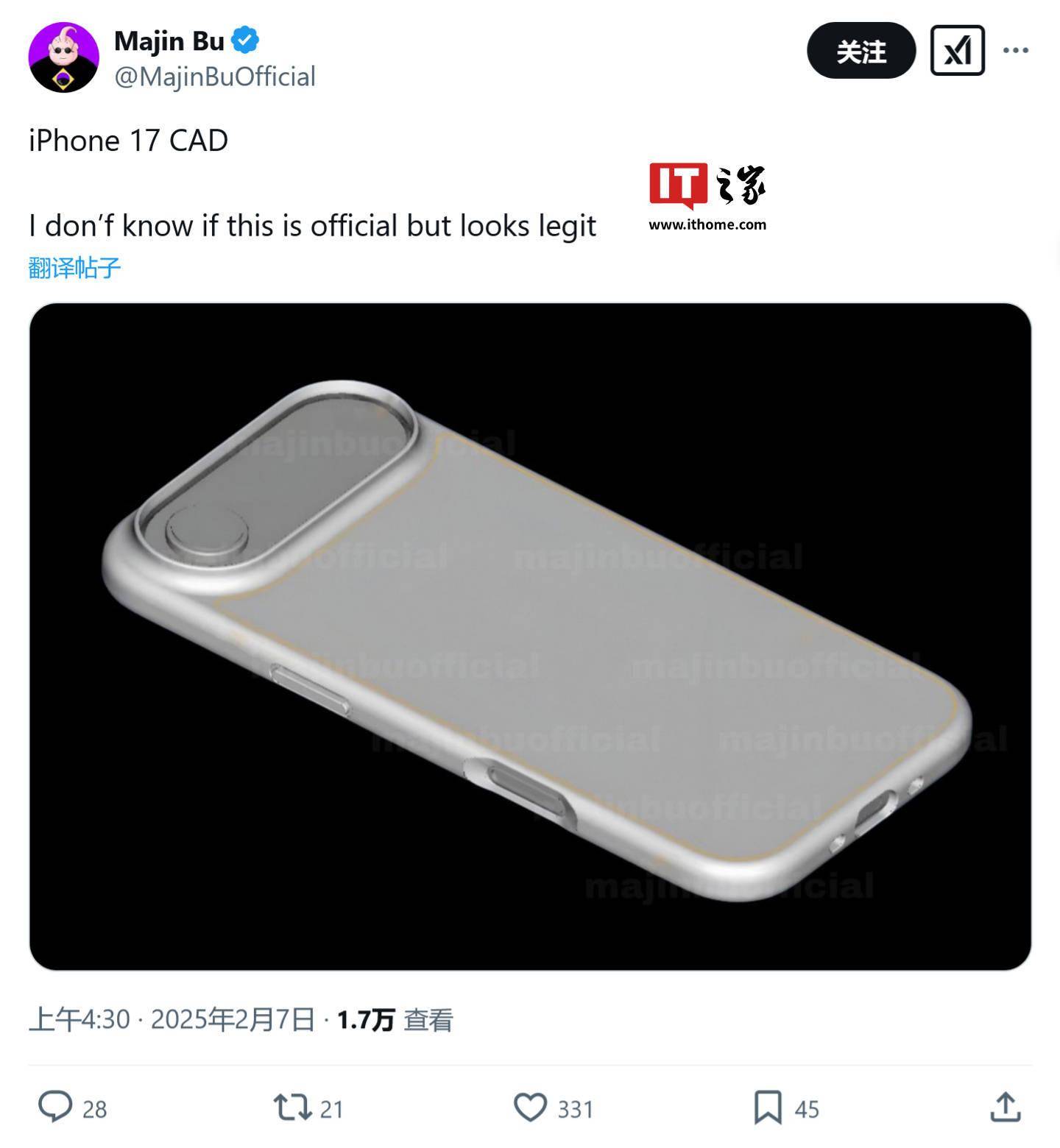 近日,一则关于iPhone 17标准版设计的爆料引起了广泛关注。据X平台用户Majin Bu在2月7日发布的推文显示,他分享了一张据称是iPhone 17标准版的手机壳渲染图,这张图揭示了新款iPhone背部摄像头区域的独特设计。