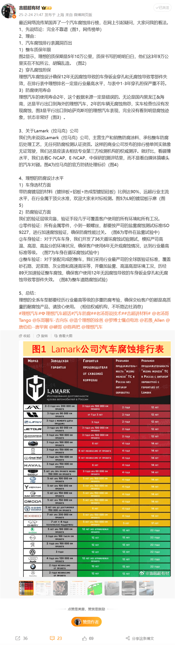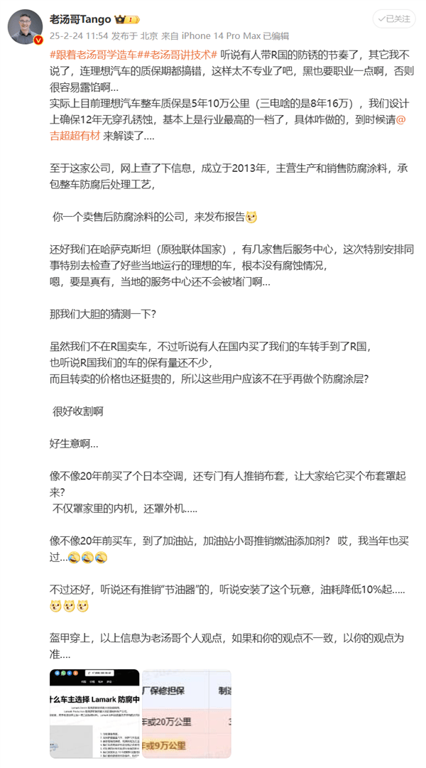 理想汽车的产品线负责人@老汤哥也加入了吐槽行列,他表示听说有人试图通过这份榜单来抹黑理想汽车的防锈能力,但连质保期都搞错,这样的行为实在太过不专业。他进一步调查发现,拉马克公司主要从事防腐涂料的生产和销售,并承包整车防腐后处理工艺,这样的身份发布这样的榜单,难免让人对其动机产生怀疑。
