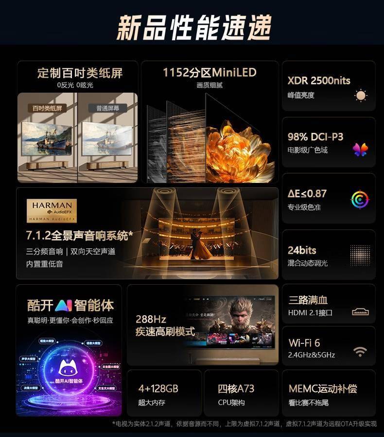 在性能方面,这款电视搭载了四核A73处理器,配备了4GB内存和128GB存储空间,确保了流畅的操作体验。它还配备了7.1.2全景声音响系统(实际为2.1.2声道,支持虚拟至7.1.2声道),包括三分频音响、双向天空声道和内置重低音,且通过了哈曼卡顿认证,为用户带来沉浸式的音频享受。