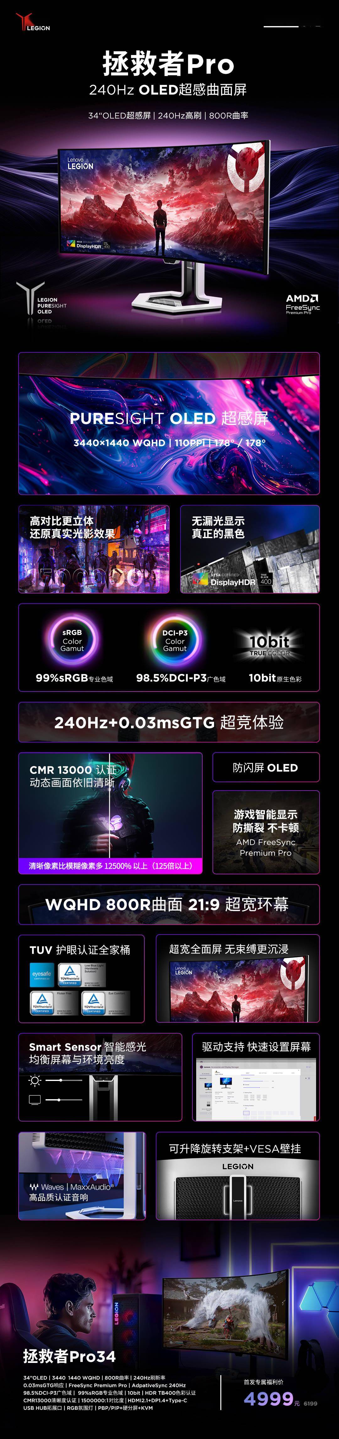 联想拯救者Pro 34英寸240Hz OLED曲面屏显示器首发,仅需4999元!