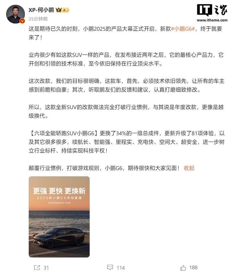 小鹏汽车的董事长何小鹏也在个人社交媒体上分享了这款新车的亮点。他提到,2025款小鹏G6的改款方式颠覆了行业的常规做法,不仅是一次简单的年度改款,更像是跨越级别的更新换代。据他介绍,新车更换了高达34%的一级总成件,并对81项体验进行了更新升级,此外还包括了许多其他方面的改进。新车拥有超长续航、强大智能系统、实际里程表现优异、快速充电、宽敞空间以及卓越的安全性。