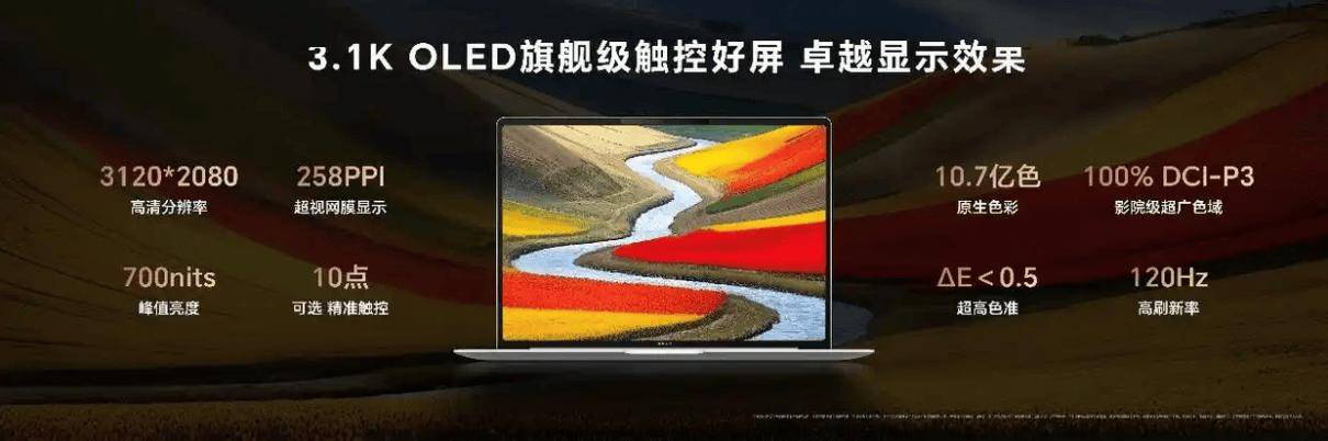 荣耀MagicBook Pro 14的显示屏同样令人印象深刻,配备了一块14.6英寸的3.1k OLED触控屏,分辨率高达3120*2080,3:2的屏幕比例为用户提供了更为宽广的阅读视野。这块屏幕与MagicBook Art 14所搭载的为同款,其屏幕面积在同尺寸产品中首屈一指,超越了同期发布的多款竞品。