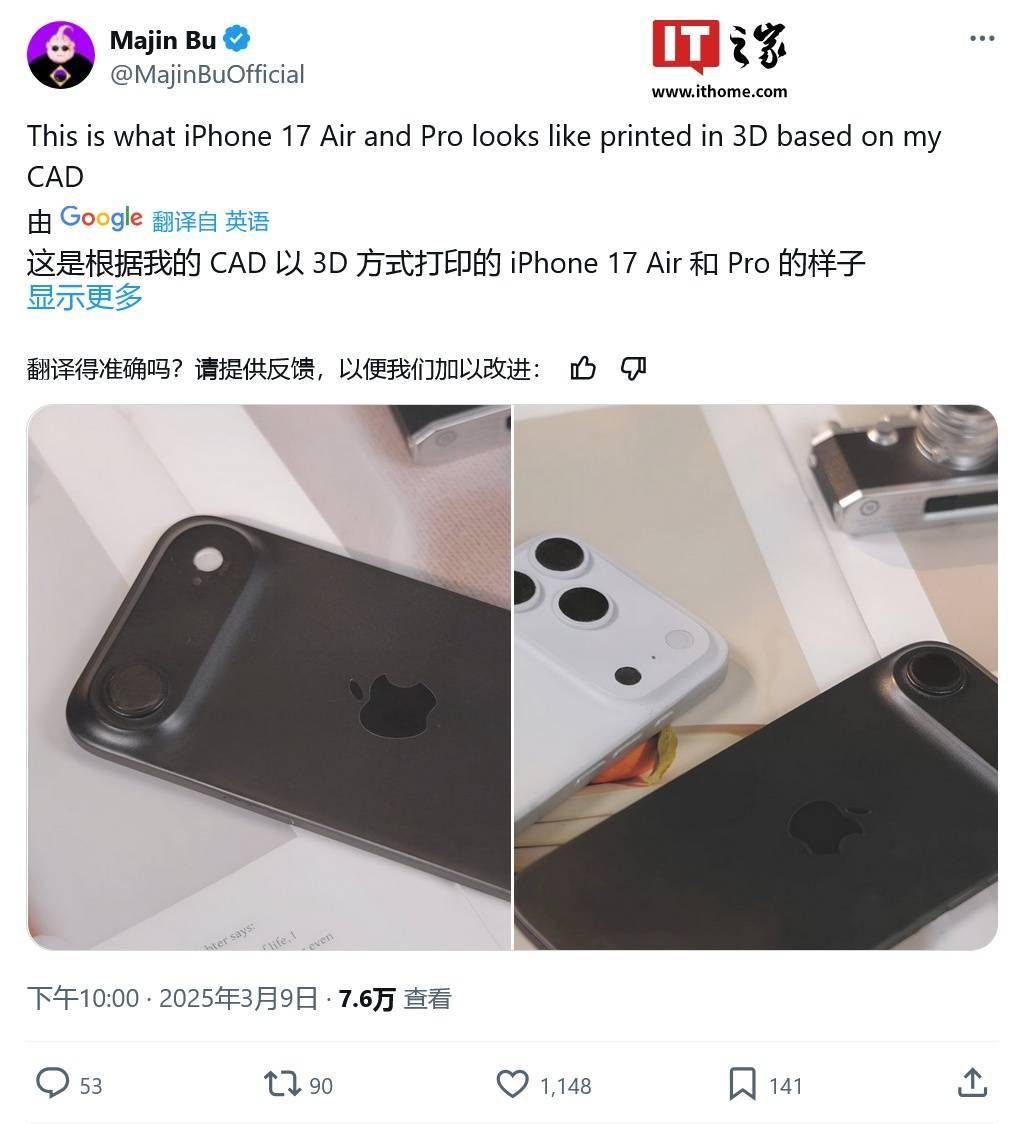 近日,有关苹果下一代iPhone的传闻再次引发热议。据知名爆料账号@MajinBuOfficial在社交媒体上发布的最新消息,该账号基于此前曝光的CAD设计图,成功3D打印出了iPhone 17 Air和iPhone 17 Pro两款机型的实体模型。