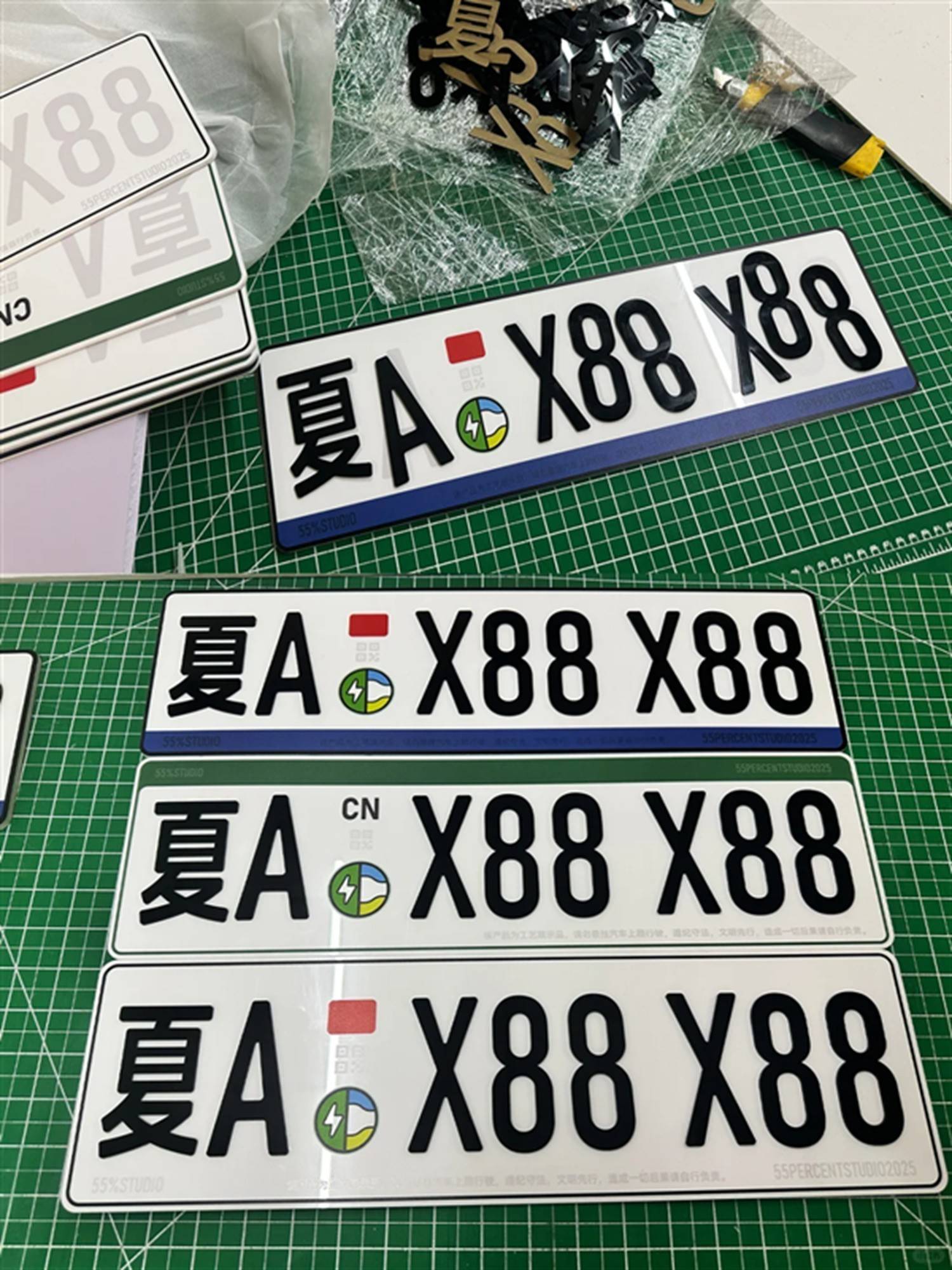 在这场讨论中,网友们不仅表达了对现有车牌设计的不满,更有不少人亲自上阵,设计出了自己心目中的理想车牌样式。其中,博主@55%Studio的创意作品尤为引人注目。这位博主通过与工厂老板的合作,成功将两种创新车牌设计从图纸变为现实。