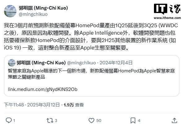 值得注意的是,苹果在去年的WWDC 2024大会上展示的新版Siri,就曾因开发周期较长而宣布将延迟上线。苹果方面表示,新版Siri预计将在“未来一年内”逐步推出。因此,郭明錤关于新款HomePod因软件问题而推迟量产的预测,似乎也在情理之中。