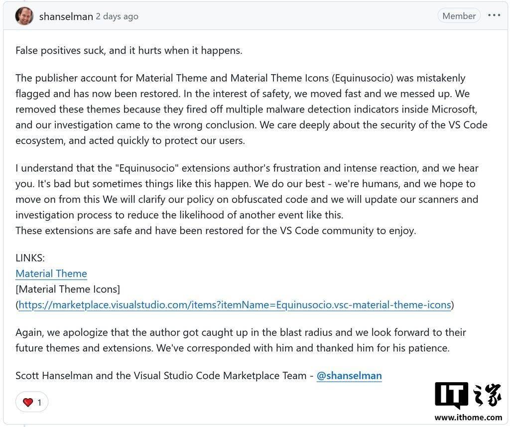Scott Hanselman代表微软发表了道歉声明,他承认误判确实令人沮丧,并表示微软之所以迅速行动,初衷是为了保护用户安全。但他同时也坦诚地承认,这次判断失误了。为了弥补这一过失,微软已经恢复了这两款扩展,并恢复了开发者“Equinusocio”的账户。